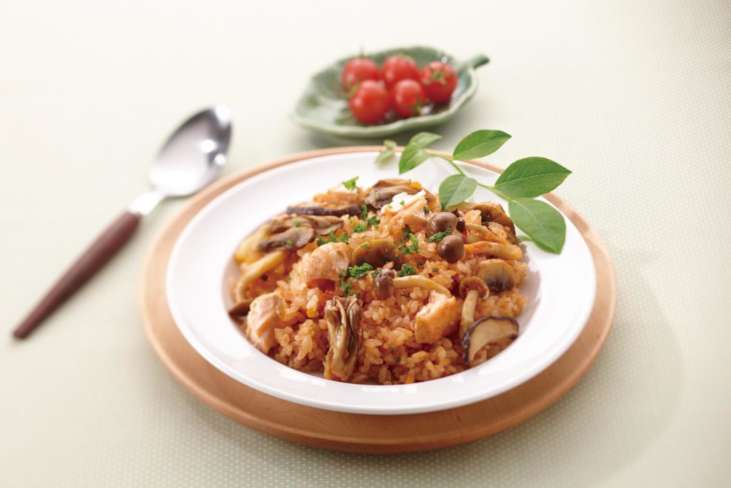 - Place the washed rice in the inner pot, add the tomato juice and fill with water up to level 3 of the “Plain” scale (level 6 for the 10-cup cooker). Add the crushed soup stock cube, salt, and pepper and mix in well. After all the sautéd ingredients have cooled, place them in the inner pot. Place a bay leaf on top and set in rice cooker. Select the “Mixed” menu and press the [Start/Rinse-free] key.
