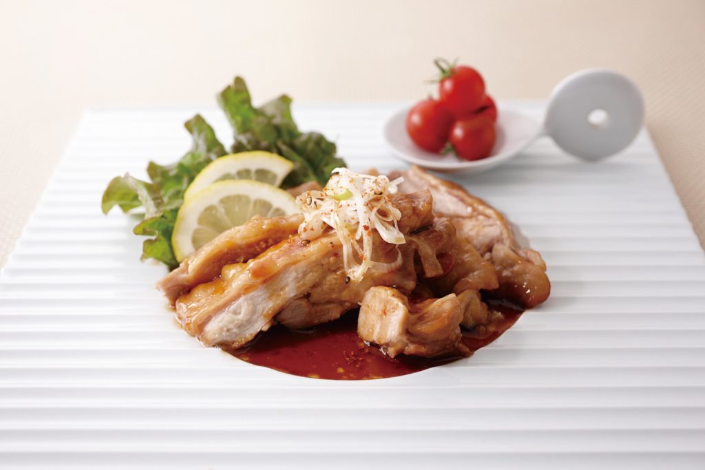 7. When cooking is complete, serve the chicken and the garnish ingredients on a plate. Season with shichimi peppers as desired.